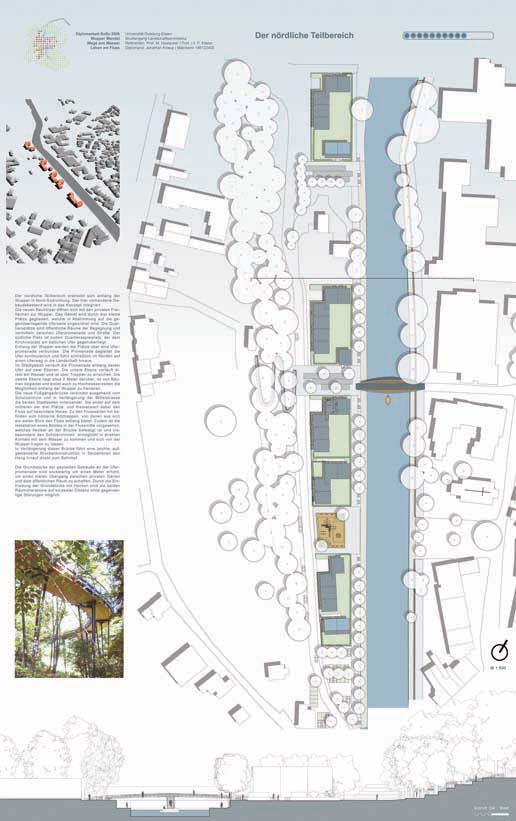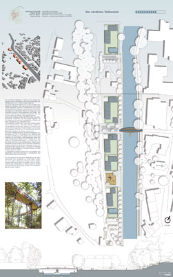 Der vorhandene Gebäudebestand wird in das Konzept integriert. Die neuen Baukörper öffnen sich mit den privaten Freiflächen zur Wupper. Das Gebiet wird durch drei kleine Plätze gegliedert, welche in Abstimmung auf die gegenüberliegende Uferseite angeordnet sind. Die Quartiersplätze sind öffentliche Räume der Begegnung und vermitteln zwischen Uferpromenade und Straße.